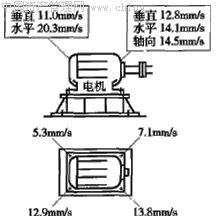 撫順石化公司石油二廠循環(huán)水場一臺風機由功率為160kW、轉(zhuǎn)速為1485r/min的電機驅(qū)動,運行過程中振動異常。電機各測點振動值如圖4所示,振動頻率以工頻為主,并測得水平和垂直方向振動相位差約140°。若電機轉(zhuǎn)子存在動不平衡,電機水平與垂直方向的振動相位差應為90°左右,電機存在動不平衡的可能性很小。分析認為,由于軸向振動較大,電機與風機存在不對中,再者電機四個地腳振動有一側振動偏高,在排除其螺栓存在松動的可能后,認為電機地腳剛性不足。經(jīng)加固基礎工業(yè)后,機組運行恢復正常。