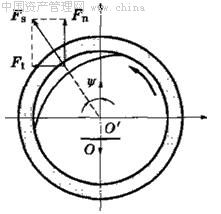 高速離心機轉(zhuǎn)子或其它空心高速轉(zhuǎn)子在內(nèi)壁的局部吸附油或水汽等冷凝后的液體,當轉(zhuǎn)軸旋轉(zhuǎn)時,這種液體會使轉(zhuǎn)子失穩(wěn)。如圖3,當轉(zhuǎn)軸高速轉(zhuǎn)動時,液體沿00′的方向甩向轉(zhuǎn)子內(nèi)壁。但此液體并不是停留在00′的延長線上,而是因粘性被帶至沿長線一側,其重心位于與00′夾角為Ψ的直線上。將液體的離心力Fs分解為Ft和Fn兩個分力,因Ft與O0′垂直,故使轉(zhuǎn)子發(fā)生失穩(wěn)而產(chǎn)生振動,其產(chǎn)生的頻率一般為轉(zhuǎn)速頻率。