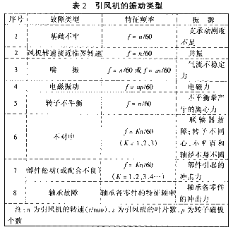 從振動診斷的角度來看,①引風機是一種旋轉(zhuǎn)機械因而有不平衡、不對中之類的故障,②引風機是一種流體機械,有旋轉(zhuǎn)失速、喘振的可能性存在,③引風機受工作環(huán)境的影響,經(jīng)常造成葉片的磨損,介質(zhì)還可能粘附在轉(zhuǎn)子上形成隨機性變化的不平衡,④引風機由電機驅(qū)動,可能存在電磁振動。為此,引風機的振動可歸結(jié)為8種類型,見表2。