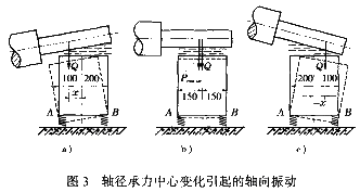 所謂軸承扭振是軸在旋轉(zhuǎn)狀態(tài)下,軸承對軸的承力中心點將隨轉(zhuǎn)速周期性地沿軸向變化。圖3a表示轉(zhuǎn)子在某一位置時,軸承承力中心點偏于A側(cè);圖3c表示轉(zhuǎn)子轉(zhuǎn)過180°后,軸承承力中心點偏于B側(cè)。若軸承座和基礎(chǔ)沒有彈性,則軸承承力中心點的變化始終在軸承座底邊AB范圍內(nèi),它不會引起軸承座的軸向振動。實際上,軸承座和基礎(chǔ)組成的支承系統(tǒng)具有一定的彈性,在軸承承力中心點周期性變化的作用下,軸承座將沿某一底邊發(fā)生周期性的軸向振動,且振值忽大忽小,極不穩(wěn)定。即使軸承座固定螺栓很緊,這種現(xiàn)象也難以避免。